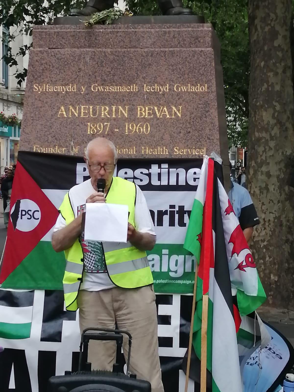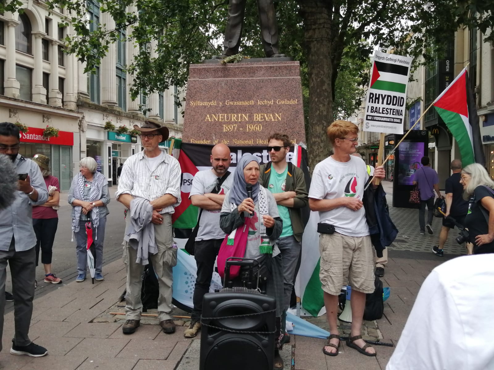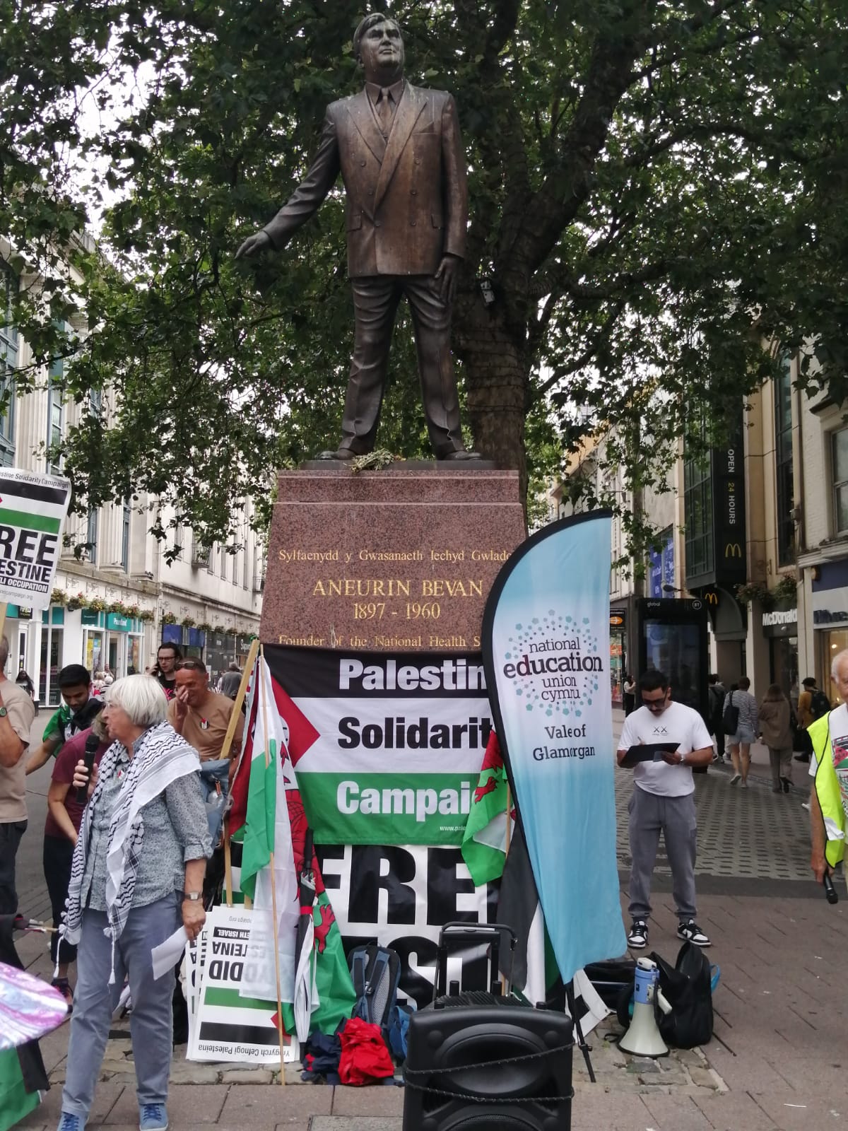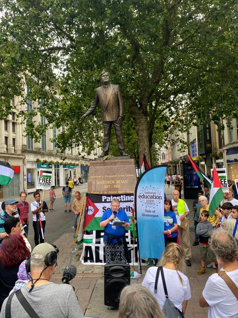 RCT PSC and other PSC branches in Wales had a wonderful weekend , celebrating the work of Freedom Flotilla Coalition We welcomed the Handala to Cardiff on Friday July 7th followed by a public meeting in the Senedd. Saturday 8th was a very busy day with an emergency demo called “Hands off Jenin” where we had many amazing speakers and Kathleen Steelandt could help me fly the flag for the National Education Union: Wales International solidarity Network in solidarity with Palestine. We marched with banners to the BBC building where we handed in a letter protesting at their coverage of Palestine in the media.