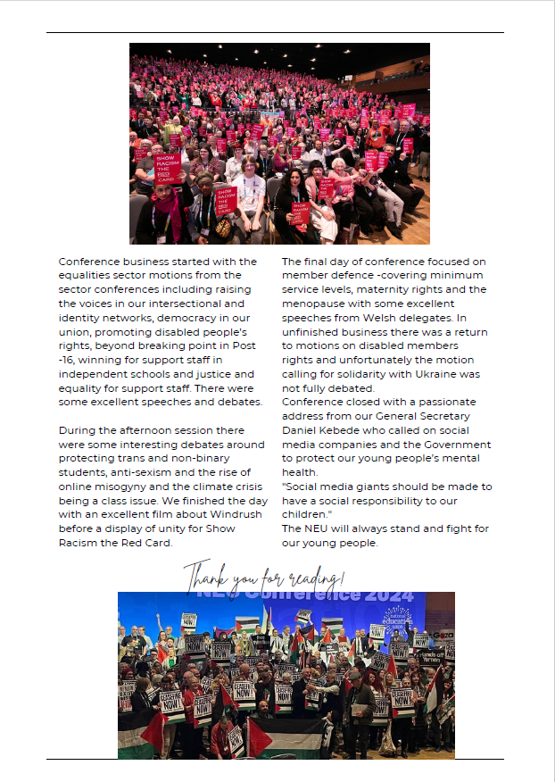 • Task and Finish Group will meet after Easter and consider the next steps in our Support Staff strategy in the light of Conference Resolutions.