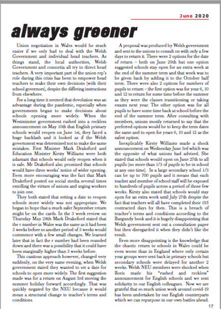 Accepting that there will be a full school return in September, it was agreed to call a meeting of the National Executive on 20 August, followed by briefings for branch Secretaries and reps before the new term. The JGSs took on board comments from OSG (and via strategy committees) for fine-tuning the strategy document.